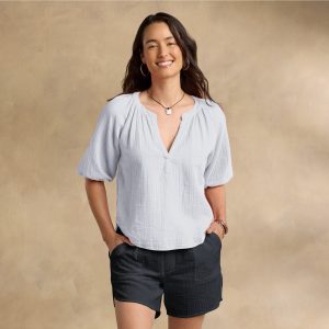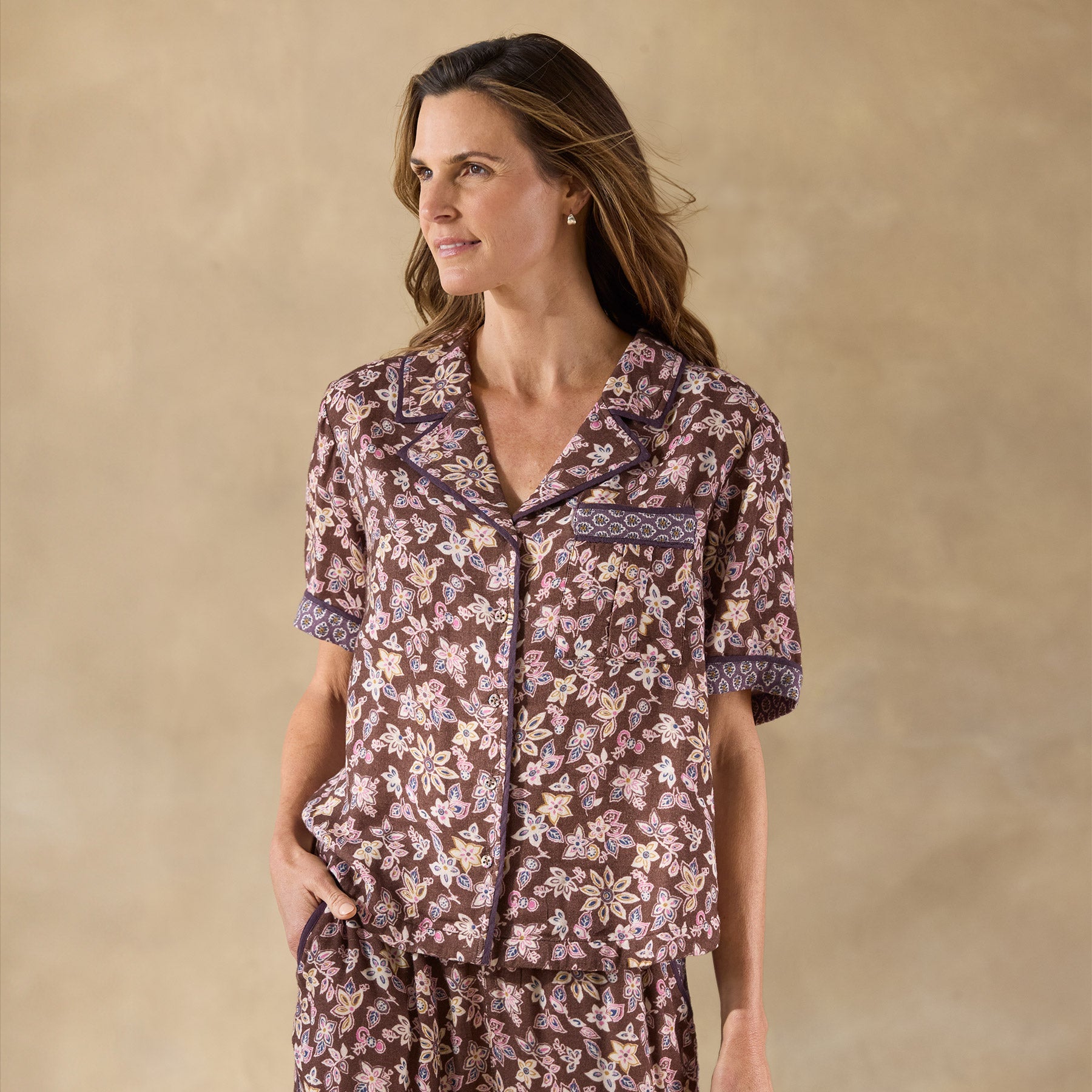 The coziest. mixed-print double cloth pajama top fashioned from yarn-dyed cotton. with covered laundry button front. lace and piping detail throughout and one pleated pocket. Machine wash. Imported. Exclusive. Sizes XS (0–2). S (4–6). M (8–10). L (12–14). XL (16–18). XXL (20–22). Approx. 25l. This item is running large. please size down a size.