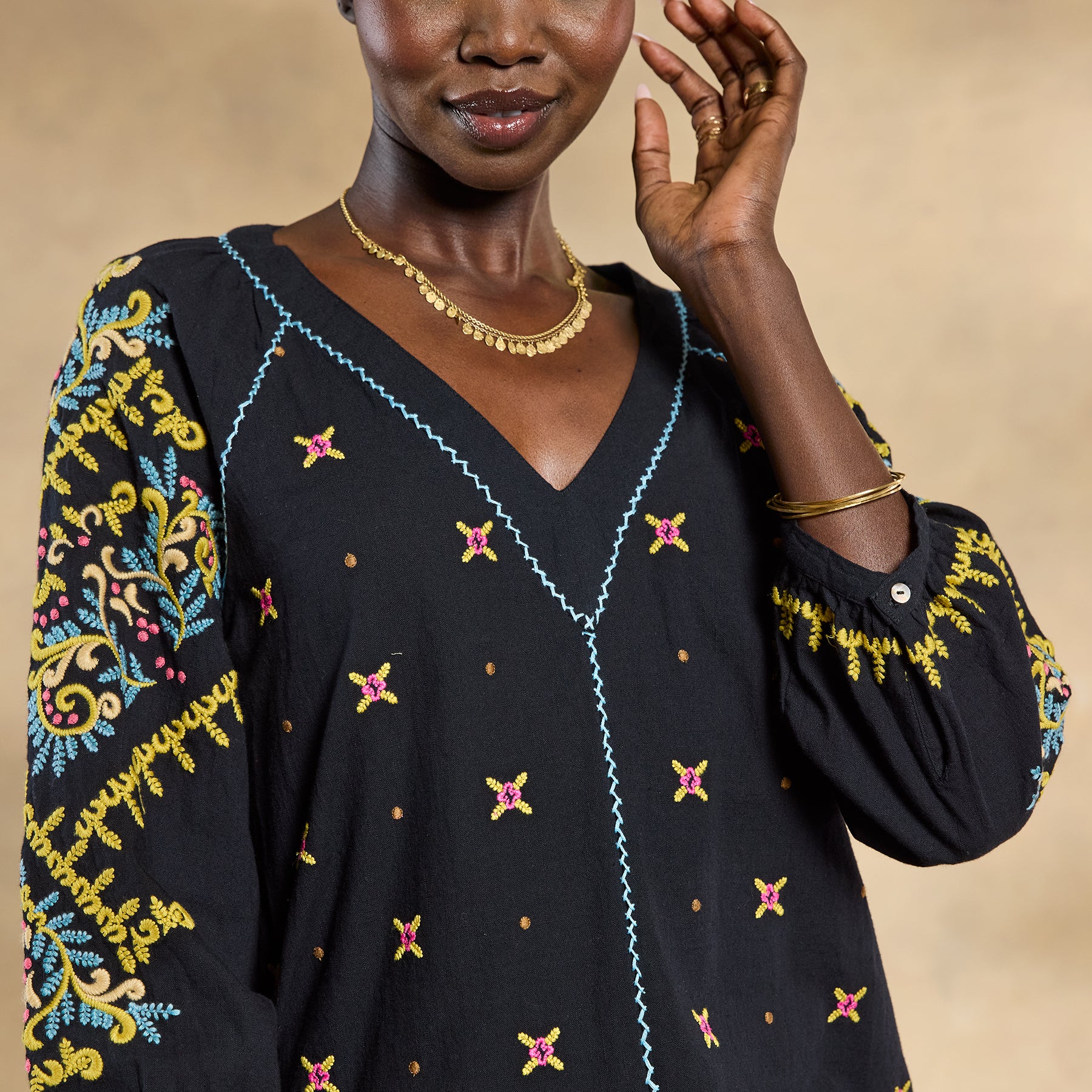 There’s joyful bohemian flair in this yarn-dyed top with luscious allover embroidery. blanket stitch details. three-quarter sleeves. shell buttons and V-neck. Full. easy fit. Cotton. Machine wash. Imported. Exclusive. Sizes XS (0 to 2). S (4 to 6). M (8 to 10). L (12 to 14). XL (16 to 18). XXL (20 to 22). Approx. 24-1/2L.