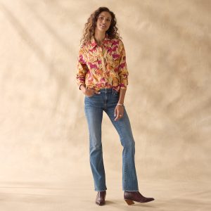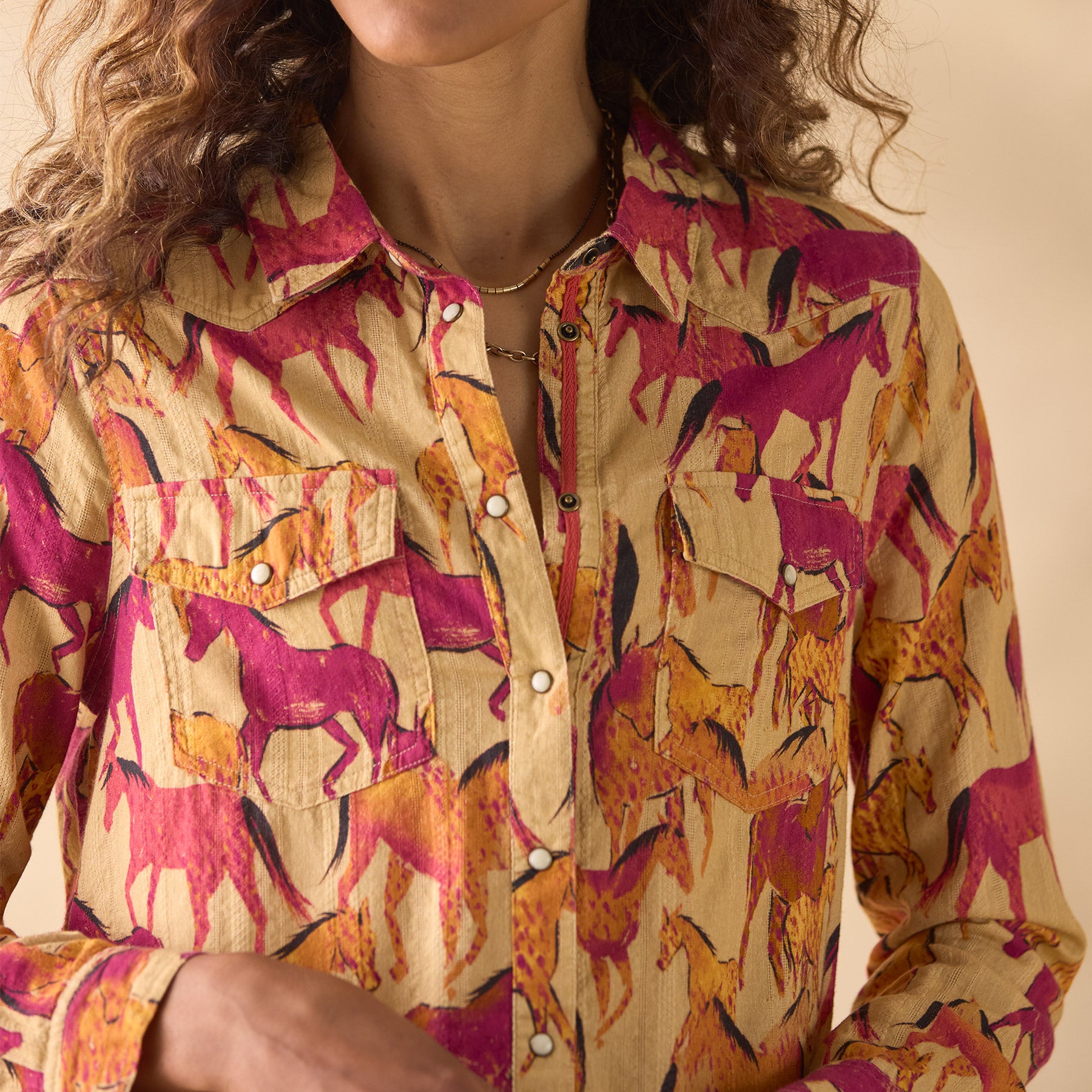 Western-inspired. pearlized snap front shirt in the prettiest cotton dobby with equestrian print. Two chest pockets. lace detail at back neck. grosgrain ribbon at placket. Western back yoke and shirttail hem. Machine wash. Imported. Exclusive. Sizes XS (0–2). S (4–6). M (8–10). L (12–14). XL (16–18). XXL (20–22). Approx. 27l.