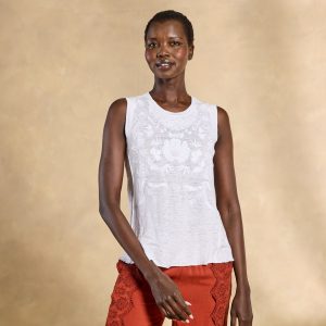 A true statement piece. our breezy linen tank embellished with tonal embroidery. French knot and raw-edge details. scalloped hem and embroidered side panels. Hand wash. Imported. Exclusive. Sizes XS (0 to 2). S (4 to 6). M (8 to 10). L (12 to 14). XL (16 to 18). XXL (20 to 22). Approx. 24L.