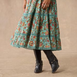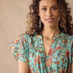 Feminine and flowing. a palette of gorgeous florals with contrast border print details. pintucking. elastic waist. double flutter sleeves and tiered hem. Fully lined. Cotton/silk. Hand wash. Imported. Exclusive. Sizes XXS (00). XS (0–2). S (4–6). M (8–10). L (12–14). XL (16–18). Approx. 49.5l.