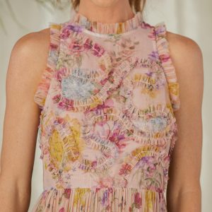 This tiered. printed mesh maxi dress is simply stunning. with ruffled mesh detail at the bodice. Sleeveless with back zip and fully lined. it has a beautiful drape and swing. Polyester. Dry clean. Imported. Sizes XS (0?C2). S (4?C6). M (8?C10). L (12?C14). XL (16?C18). Approx. 57.5l.