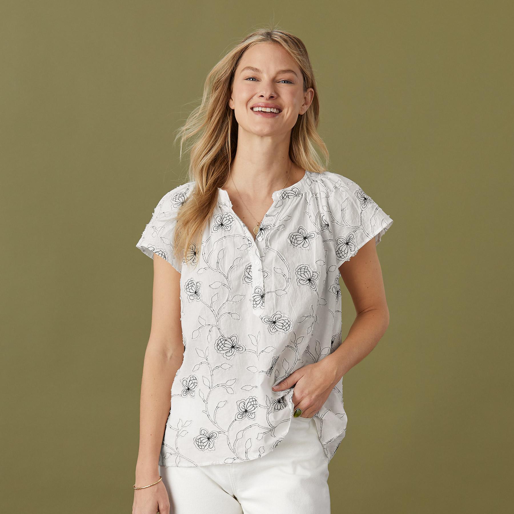 Feminine. embroidered cutwork appliqué is the star of this blouse with shirred neckline and raglan sleeves. Cotton. Machine wash. Imported. Sizes XS (0-2). S (4-6). M (8-10). L (12-14). XL (16-18). XXL (20-22). Approx. 25.5l.
