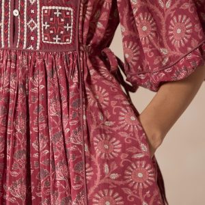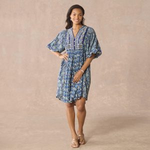 Our easy pop over dress is mixed printed and finished with stunning embroidery at the placket. a flattering V-notch neckline with three looped buttons and puff sleeves with elastic cuffs. Side ties to gather at the center front and back for the perfect fit. Cotton/viscose. Machine wash. Imported. Exclusive. Sizes XXS (00). XS (0?C2). S (4?C6). M (8?C10). L (12?C14). XL (16?C18). Approx. 38.5l.