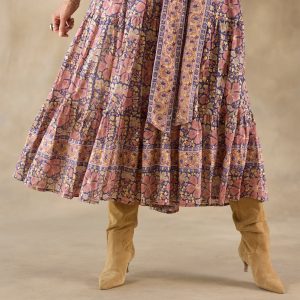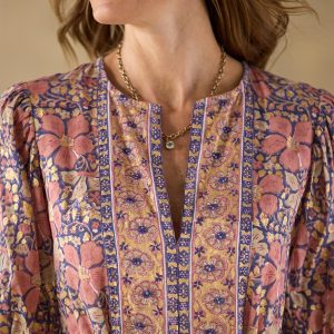 This handcrafted maxi dress features a metallic floral print with contrasting border print. elbow-length puff sleeves. a pull-over style and a self-tie belt. Cotton. Machine wash. Imported. Sizes XS (0–2). S (4–6). M (8–10). L (12–14). XL (16–18). XXL (20–22). Approx. 54l