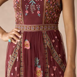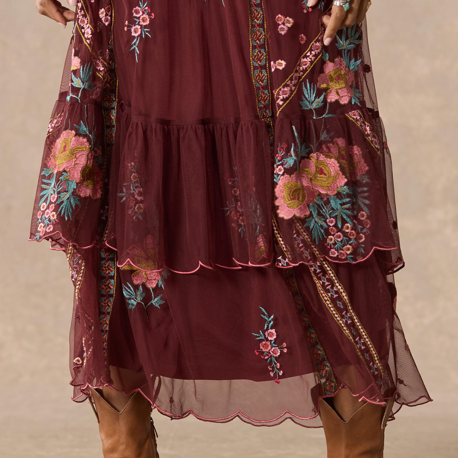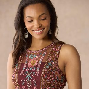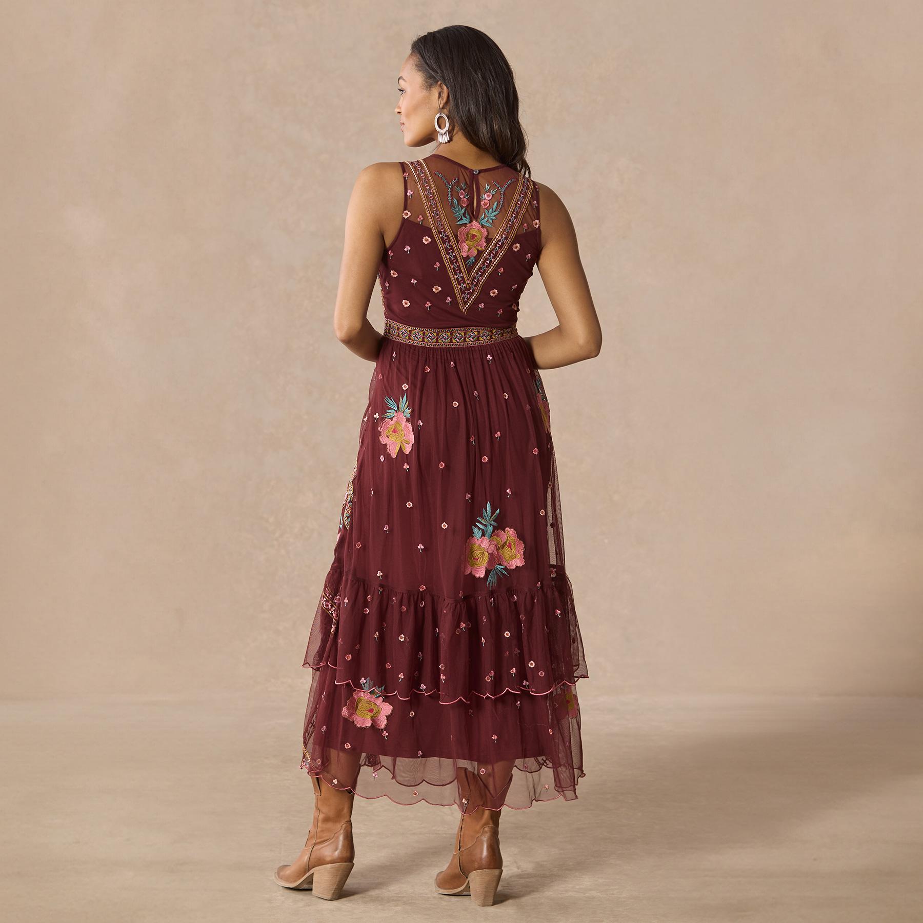 Our lovely fit and flare embroidered mesh dress features pretty florals mixed with geometric embroidery and a beautiful jewel neckline. Side zipper for an easy fit. Nylon. Hand wash. Imported. Exclusive. Sizes XS (0–2). S (4–6). M (8–10). L (12–14). XL (16–18). XXL (20–22). Approx. 54l.