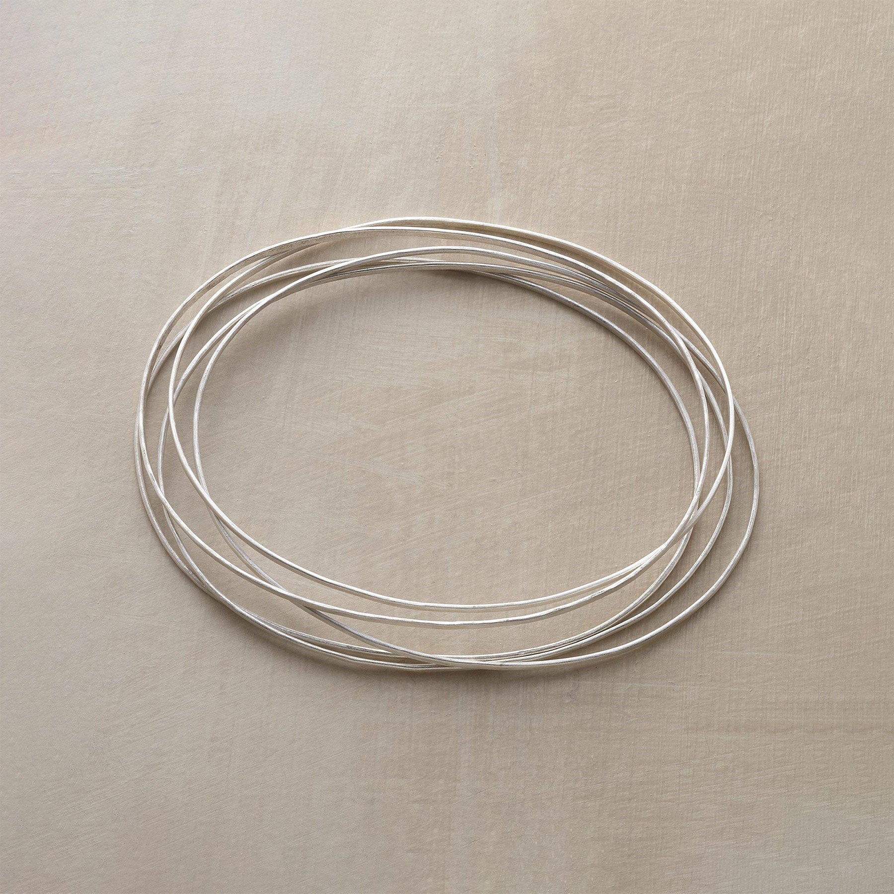 Thin-as-a-wisp bangles gather together in this Jane Diaz bangle bracelets set. their oval shape in perfect accord with the wrist’s form. Handmade of sterling silver. Set of 5. 2-3/4 oval.