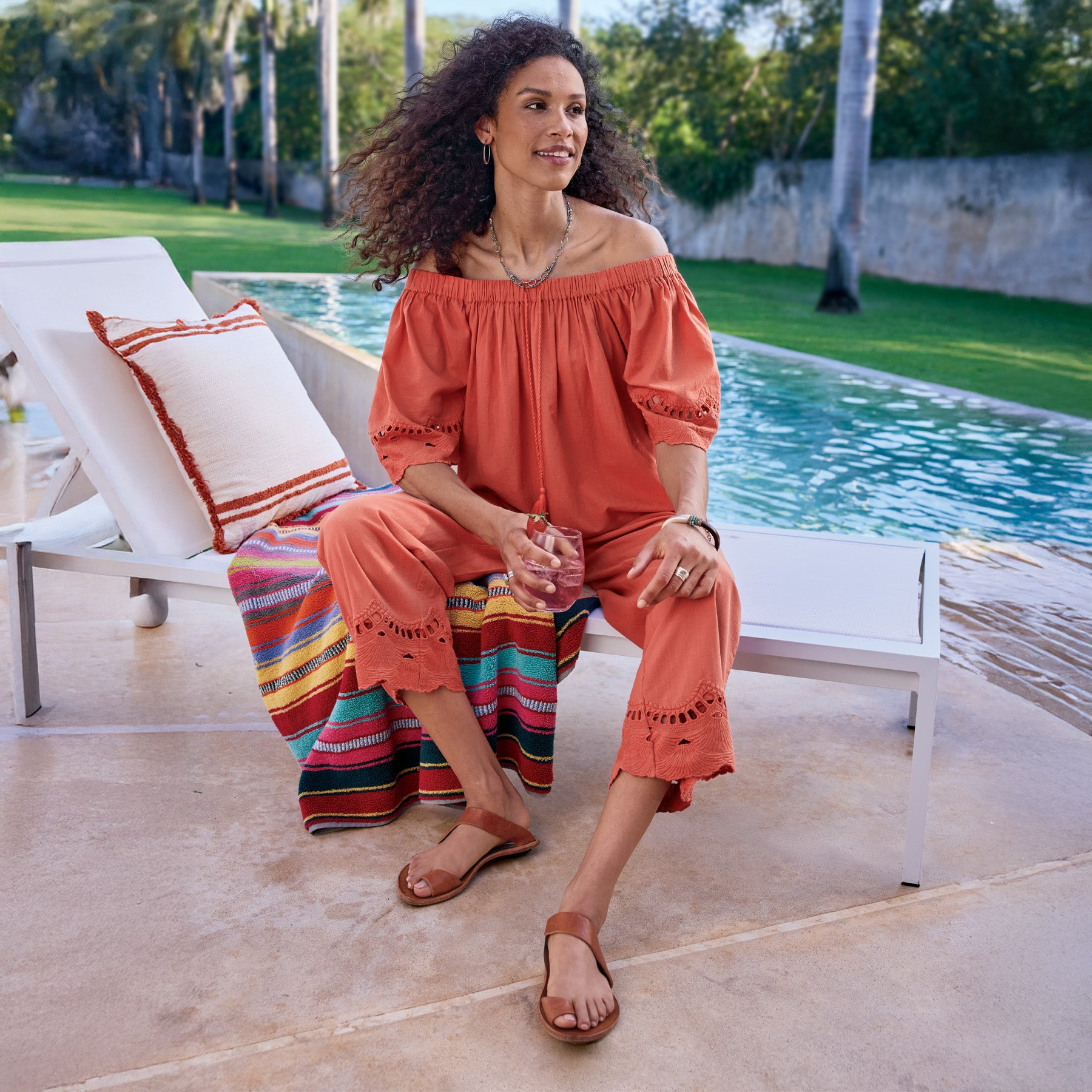 Easy. breezy cropped pants embellished with cut-out detailing and embroidery at hem. Smocked. elastic waistband with braided ties. Cotton. Machine wash. Imported. Sizes XS (4). S (6). M (8?C10). L (12). XL (14). XXL (16). 26 inseam.