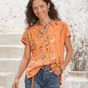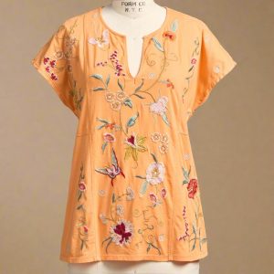 Beautiful floral and geometric embroidery flutters across the front and back of this easy-fit. notch neck top with cap sleeves and side slits. Cotton. Machine wash. Imported. Sizes XXS (2). XS (4). S (6). M (8-10). L (12). XL (14). Approx. 24.25l.