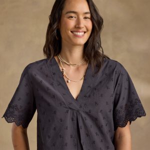 Our effortless Tara Eyelet Top features a flattering V-neck. relaxed silhouette and scalloped eyelet at the sleeves and hem. Pair with our Stella Eyelet Shorts for an adorable matched set. Cotton. Machine wash. Imported. Sizes XS (0–2). S (4–6). M (8–10). L (12–14). XL (16–18). XXL (20–22). Approx. 24.75l.